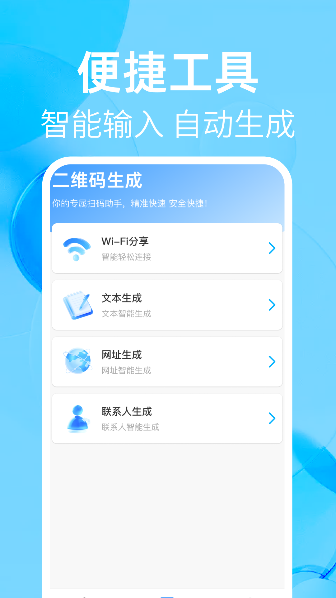 1、 输入文本、网址、电话号码、名片信息等,即时生成对应二维码,并提供历史生成记录的保存与管理功能。