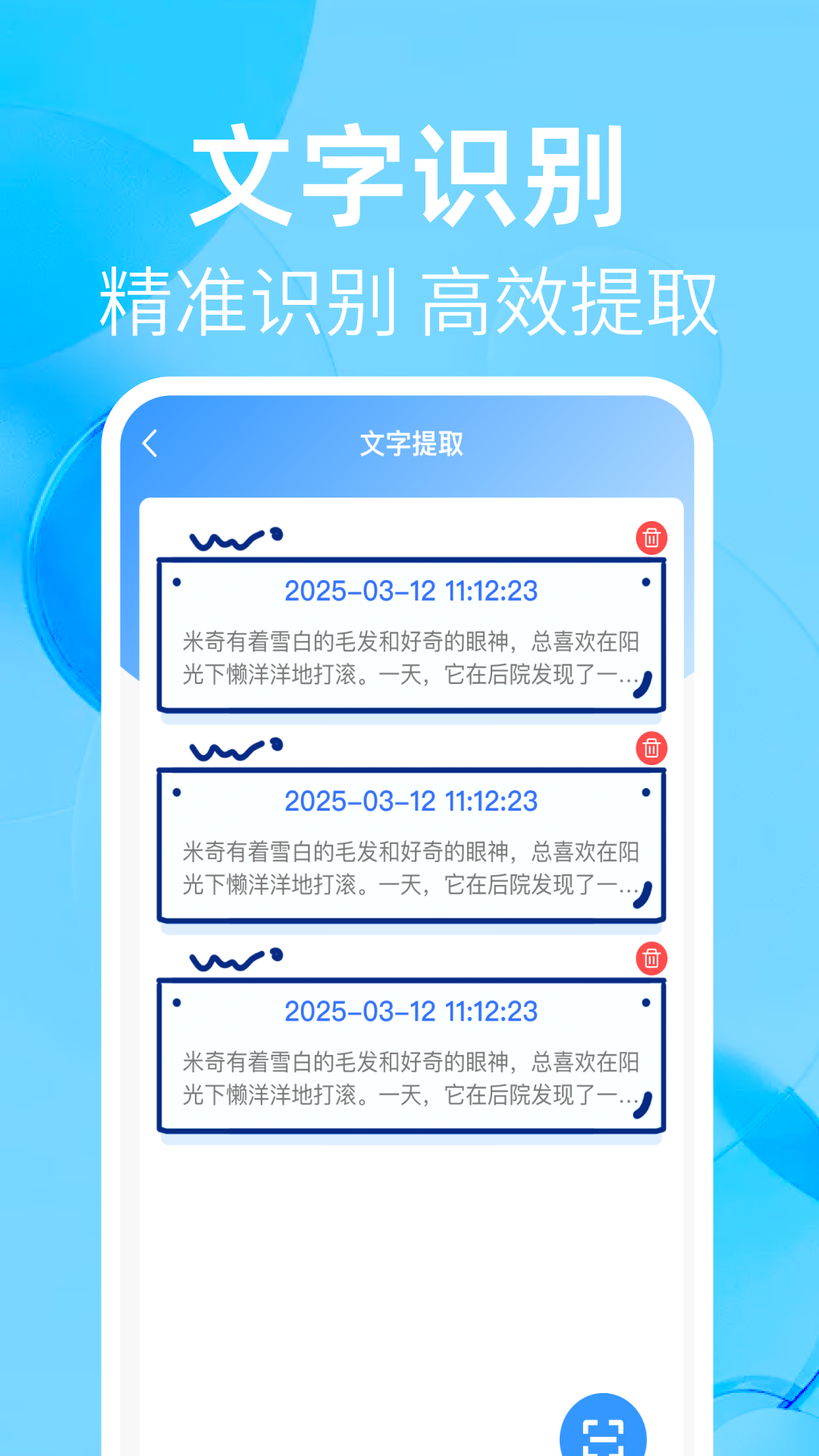 2、 从相册选择或直接拍摄包含文字的图片,软件自动框选识别区域并提取文字,结果支持编辑、复制或导出为文本文件。