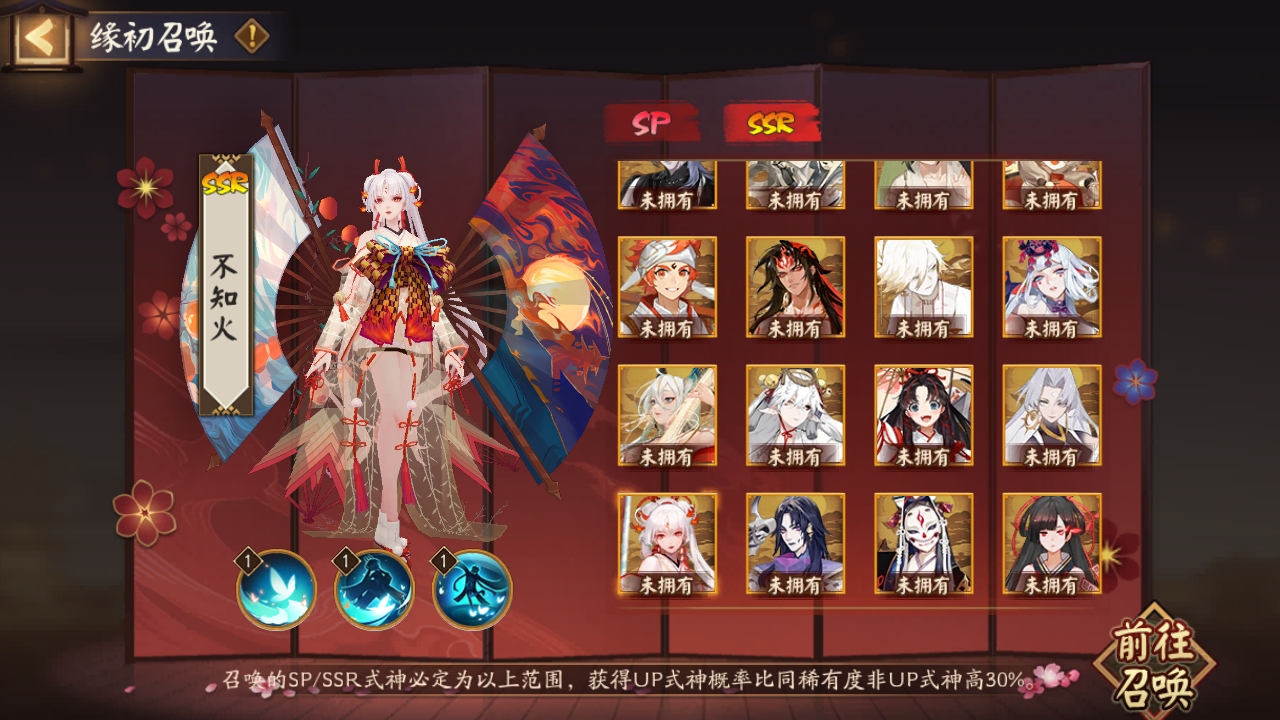 ③对于12月17日维护前已达成SSR全集赏或持有SSR全集赏体验卡的大人,本期SP阶式神梦山白藏主初始出现指定概率为10%,随后续召唤次数持续提升,最多450次召唤必定出现。对于其他大人,SP阶式神梦山白藏主初始出现指定概率为3%,随后续召唤次数持续提升,最多800次召唤必定出现。
